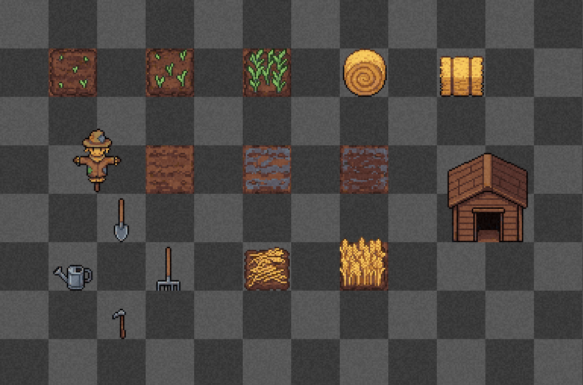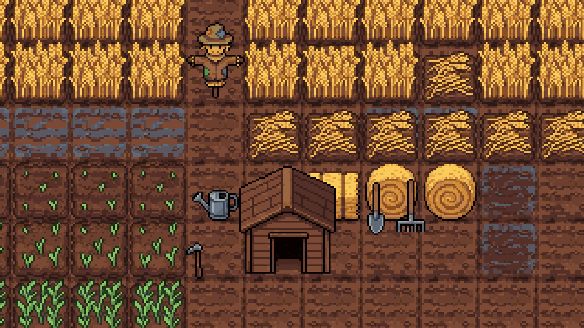 A selection of farm-themed assets including crop tiles, tilled soil, hay bales, scarecrow, tools, and small props. Everything is designed to fit together naturally and add depth and life to your game world.